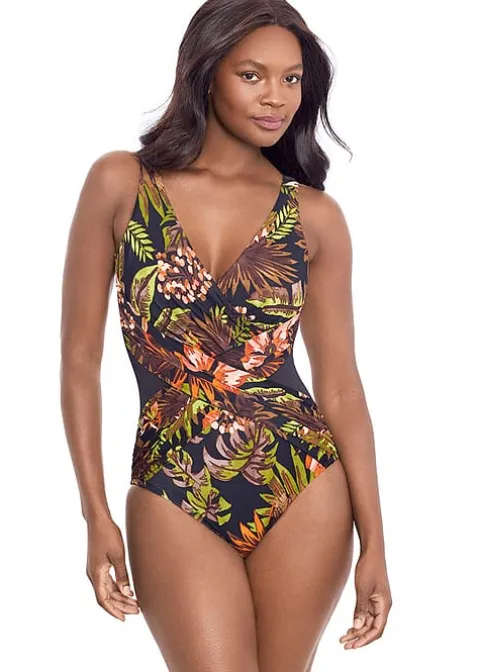 Miraclesuit Botanico is a gorgeous and rich swimsuit, with a stunningly detailed pattern and colour scheme. This is a classic tropical print swimsuit, with a timeless and beautiful orange and green palette that is simply so entrancing. This is one of the most stunning and exciting new swimsuit designs in the Miraclesuit range. And of course, Being Miraclesuit, is comes with an in built tummy control that slims and shapes your figure. It also features soft cups, a deep v-neck, and a wrap front. Variations of this item are available.