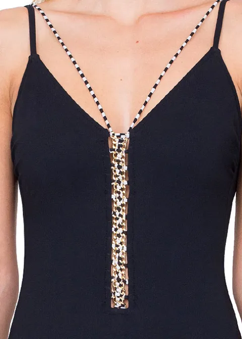 Gottex have been called many things and been summed up by many different names and descriptions, but one thing that always comes up is the word “luxury”. They love to bring us gorgeous and exuberant designs that rival everything else we have ever seen before, and this is one of them. A tastefully chic all black body, a shimmering golden, white and black chain in the centre all give this swimsuit a Bond Girl image. It is magnificent and full of character and feminity.