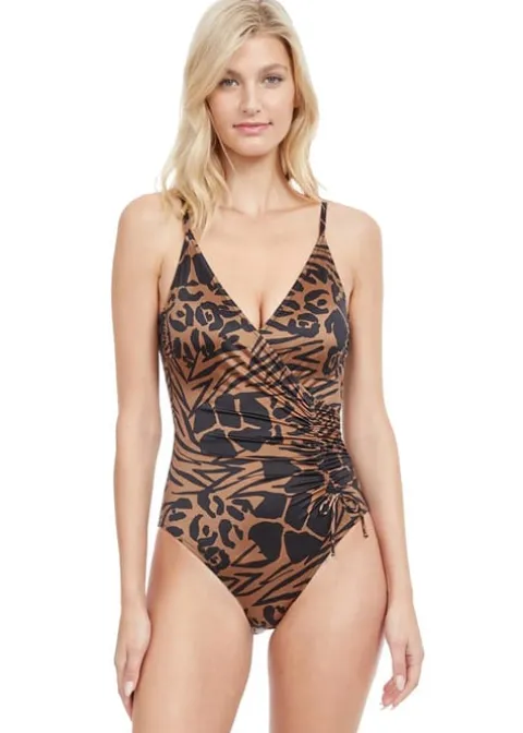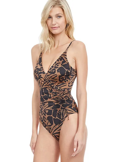 Gottex Jaguar is a stunner of a design and also a classic. It has that timeless appeal that simply fits and suits any skin tone or style. The Jaguar Thin Strap V Neck Swimsuit has a deep plunging front, soft cups for comfort, and a scoop low back for tanning. And of course, there is that classic black and bronze colour scheme, giving it jungle vibes. A one strap version is also available.