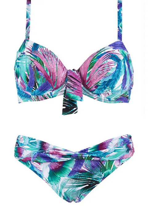 Beautiful, pastel shades and the tropical floral print make this bikini very desirable. An underwired soft cup has a tie knot in the middle to give added interest and the slightly deeper briefs have a front detail which draws the eye. Great coverage in the brief and perfect support in the top without adding any padding.
