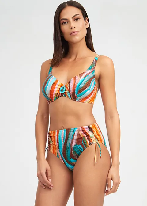 Nuria Ferrer Aquarelle is a stunning range of items that brings cool aqua blue and marine greens into concert with burning oranges and rich chocolatey browns. This is the underwired bikini, a v-neck piece with tie side high waist bottoms and a flattering fit. Matching accessories or other cuts and fits of bikinis are also available.
